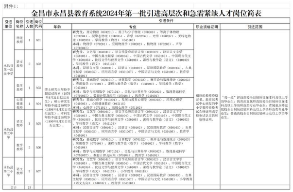 1.金昌市永昌縣教育系統(tǒng)2024年第一批引進(jìn)高層次和急需緊缺人才崗位簡表