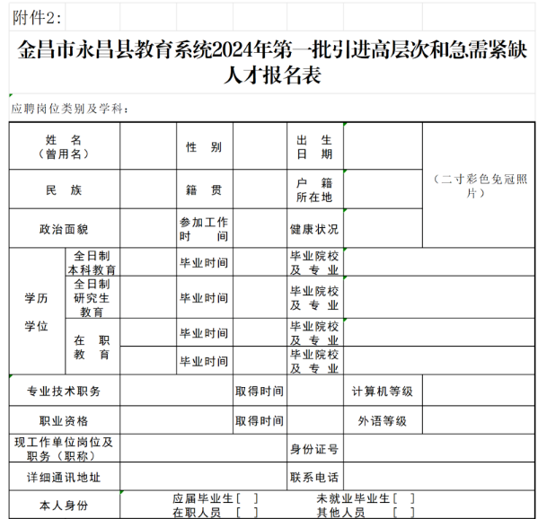 2.金昌市永昌縣教育系統(tǒng)2024年第一批引進(jìn)高層次和急需緊缺人才報(bào)名表