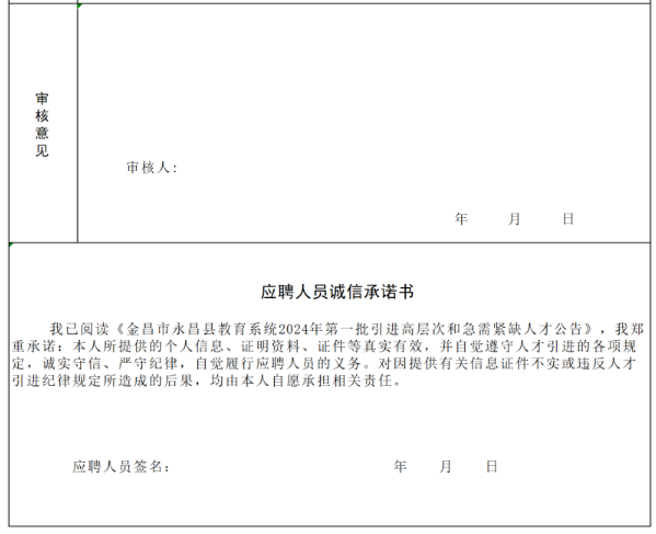 2.報(bào)名方式:采取網(wǎng)上報(bào)名和現(xiàn)場報(bào)名相結(jié)合的方式進(jìn)行。報(bào)名前,應(yīng)聘人員認(rèn)真查閱《公告》,仔細(xì)閱讀“應(yīng)聘人員誠信承諾書”和引進(jìn)崗位條件,填寫《金昌市永昌縣教育系統(tǒng)2024年第一批引進(jìn)高層次和急需緊缺人才報(bào)名表》(見附件2,以下簡稱《報(bào)名表》),每位應(yīng)聘者只允許選擇填報(bào)1個(gè)崗位,各崗位具體引進(jìn)條件以《崗位簡表》為準(zhǔn)。因個(gè)人填報(bào)信息錯(cuò)誤而導(dǎo)致的其他后果,由應(yīng)聘者本人承擔(dān)。應(yīng)聘人員提供的報(bào)名材料應(yīng)真實(shí)準(zhǔn)確,偽造或變造有關(guān)證件、材料、信息,提供虛假報(bào)名材料的應(yīng)聘人員,一經(jīng)發(fā)現(xiàn)即取消資格并按照有關(guān)規(guī)定處理。