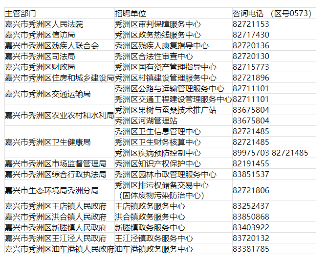 (九)本次公開招聘是秀洲區(qū)人力社保局受區(qū)級機(jī)關(guān)部門(單位)委托集中組織。對事業(yè)單位信息、報(bào)考崗位、學(xué)歷學(xué)位、所需專業(yè)要求以及其他要求等需要咨詢時(shí),請應(yīng)聘人員直接與招聘單位聯(lián)系,招聘單位的咨詢電話已在招聘公告和《計(jì)劃及崗位要求表》上列出。