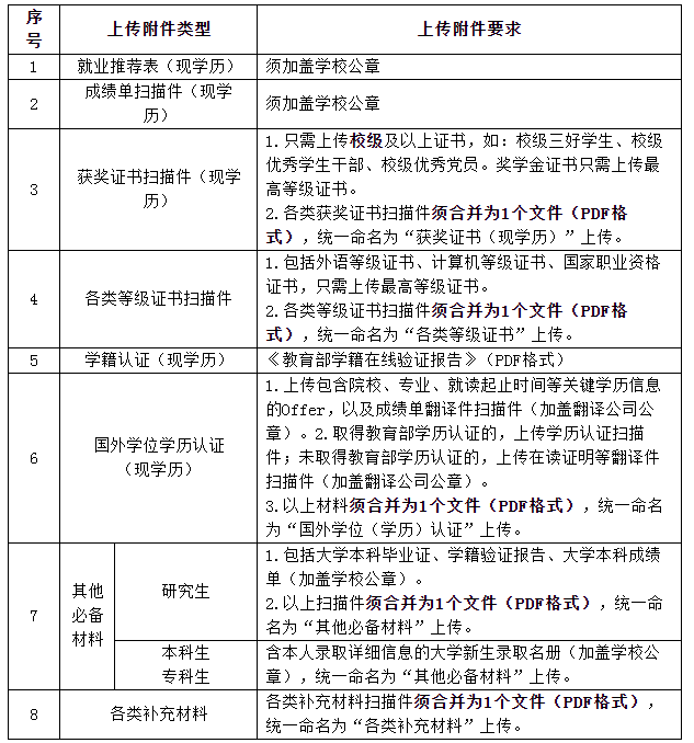 3.上傳應(yīng)聘附件材料。應(yīng)聘畢業(yè)生須通過招聘平臺(tái)及時(shí)、規(guī)范上傳個(gè)人應(yīng)聘附件材料,確保應(yīng)聘材料能正常打開、清晰顯示,應(yīng)聘附件材料文檔數(shù)量不超過8個(gè)。因應(yīng)聘材料不能正常打開、圖像不清晰或未按規(guī)范要求填報(bào)導(dǎo)致的結(jié)果由應(yīng)聘畢業(yè)生本人承擔(dān)。上傳附件具體要求如下: