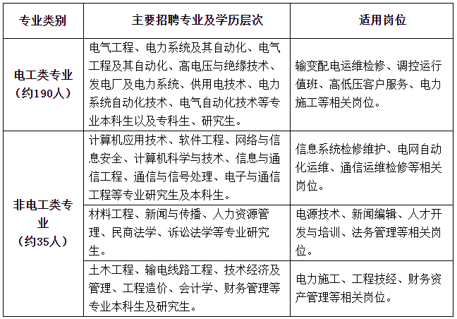 招聘專業(yè)指主修專業(yè)(不包含輔修專業(yè))。招聘專業(yè)主要為電工類專業(yè),少量招聘非電工類專業(yè)。根據(jù)2024年第一批招聘畢業(yè)生流失情況,進(jìn)行少量補(bǔ)招。最終招聘數(shù)量將根據(jù)上級(jí)單位核定情況相應(yīng)調(diào)整,主要招聘計(jì)劃如下: