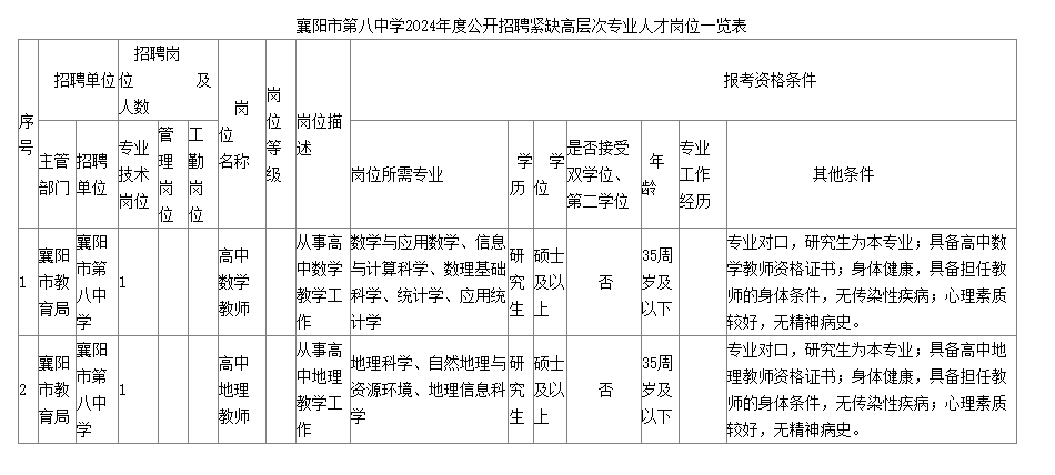 (一)襄陽市第八中學(xué)擬公開招聘緊缺高層次專業(yè)人才 2名。崗位條件詳情見《襄陽市第八中學(xué)2024年度公開招聘緊缺高層次專業(yè)人才崗位一覽表》。