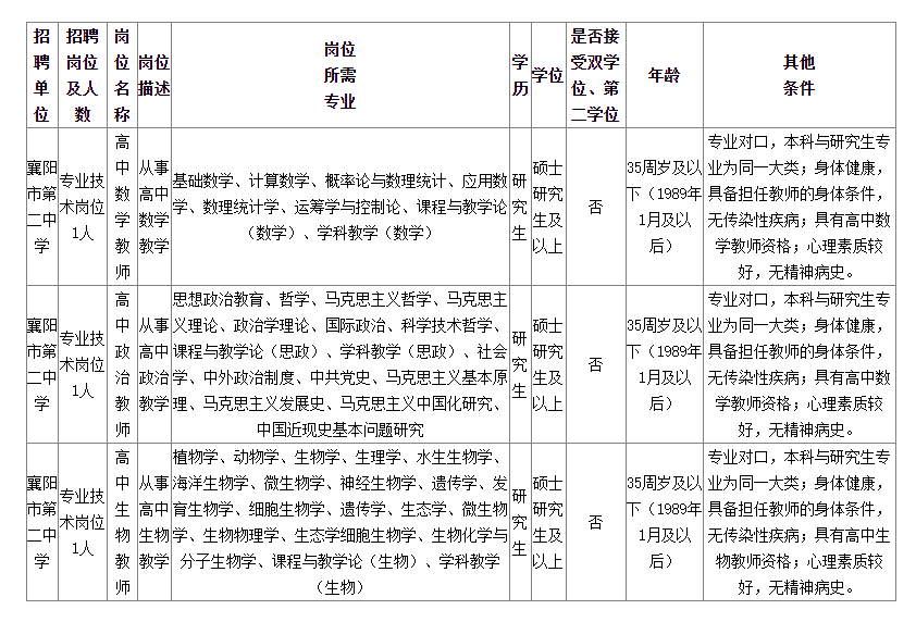 根據(jù)《事業(yè)單位公開招聘人員暫行規(guī)定》(原人事部令第6號)、湖北省人力資源和社會保障廳《關(guān)于進一步規(guī)范全省事業(yè)單位公開招聘工作的若干意見》(鄂人社發(fā)〔2016〕23號)文件精神,襄陽二中學面向社會公開招聘緊缺高層次專業(yè)人才。現(xiàn)將招聘有關(guān)事項公告如下: