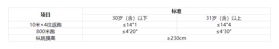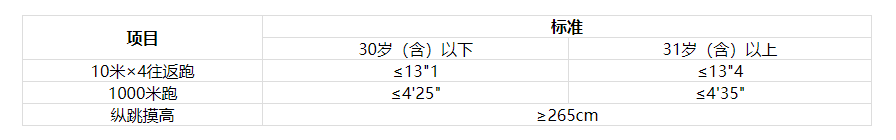 2.體能測評。參照《公安機關錄用人民警察體能測評項目和標準(暫行)》(人社部發(fā)〔2011〕48號)、國家公務員局《關于明確公安機關人民警察體能測評次數(shù)的函》(國公局函〔2012〕1號)相關要求執(zhí)行。共設三項:男子1000米跑和女子800米跑(測評次數(shù)均為1次)、10米×4往返跑(測評次數(shù)不超過2次)、縱跳摸高(測評次數(shù)不超過3次)。體能測評三個項目中有任何一項不合格或違規(guī),視為體能測評不合格。