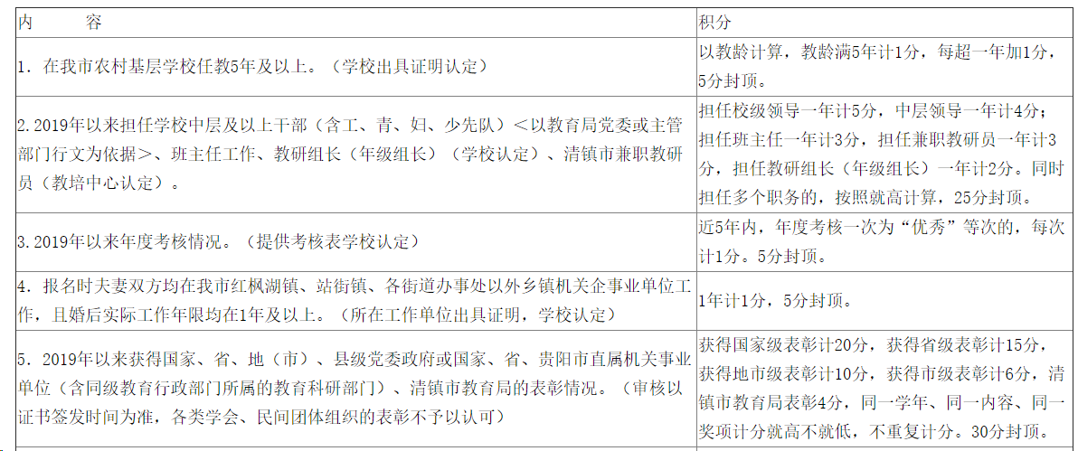 總分100分,具備下列條件的予以相應(yīng)計(jì)分,由清鎮(zhèn)市2024年面向二類學(xué)校公開(kāi)遴選中小學(xué)、幼兒園教師工作領(lǐng)導(dǎo)小組對(duì)照參加遴選教師有關(guān)條件計(jì)算獎(jiǎng)勵(lì)性積分分值,獎(jiǎng)勵(lì)性積分按照40%計(jì)入個(gè)人遴選總成績(jī)。報(bào)名人員須在2024年4月9日20:00前將所有獎(jiǎng)勵(lì)性積分的相關(guān)印證資料提交清鎮(zhèn)市2024年面向二類學(xué)校公開(kāi)遴選中小學(xué)、幼兒園教師工作領(lǐng)導(dǎo)小組辦公室審核,逾期不予受理。參加遴選教師積分情況將在清鎮(zhèn)市人民政府網(wǎng)上進(jìn)行公布(5個(gè)工作日)。