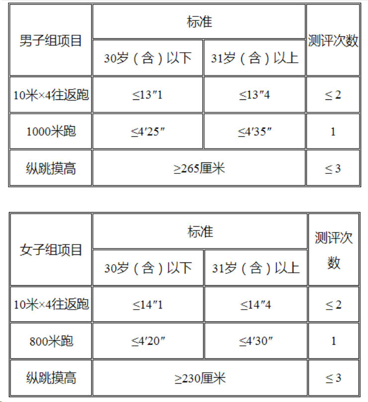 年齡計算時截止到參加體能測評當(dāng)月,即1993年4月(含)以后出生的考生體能測評按照30歲(含)以下的標(biāo)準(zhǔn)執(zhí)行,1993年3月(含)以前出生的考生體能測評標(biāo)準(zhǔn)按照31歲(含)以上的標(biāo)準(zhǔn)執(zhí)行。