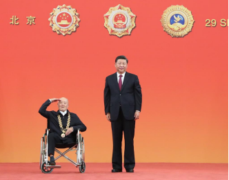 這枚勛章,是習(xí)近平總書(shū)記親自頒授的。2019年9月29日,新中國(guó)成立70周年之際,國(guó)家勛章和國(guó)家榮譽(yù)稱號(hào)頒授儀式在北京人民大會(huì)堂隆重舉行。作為首批“共和國(guó)勛章”獲得者之一,張富清坐著輪椅上臺(tái)領(lǐng)獎(jiǎng)??倳?shū)記俯下身,鄭重地將勛章佩戴在張富清胸前。