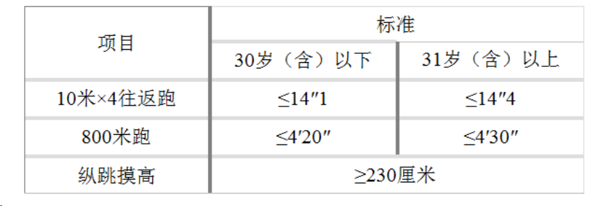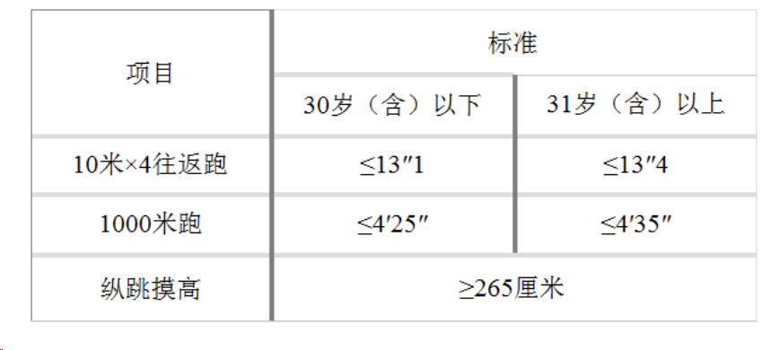 體能測評項(xiàng)目三項(xiàng)全部達(dá)標(biāo)方為合格。報(bào)考緊缺職位的考生,體能測評項(xiàng)目三項(xiàng)中有兩項(xiàng)達(dá)標(biāo)的,視為合格。體能測評項(xiàng)目中,縱跳摸高項(xiàng)目的測評次數(shù)不超過3次,10米×4往返跑項(xiàng)目的測評次數(shù)不超過2次,男子1000米跑、女子800米跑項(xiàng)目的測評次數(shù)均為1次。