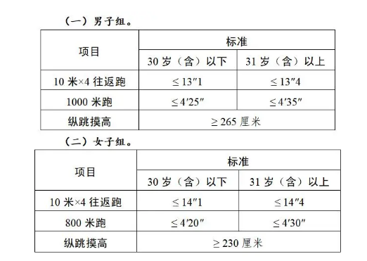 體能測評三項全部達(dá)標(biāo)方為合格。體能測評項目中,縱跳摸高的測試次數(shù)不超過3次,10米×4往返跑的測試次數(shù)不超過2次,長跑項目(男子1000米、女子800米)的測試次數(shù)為1次。