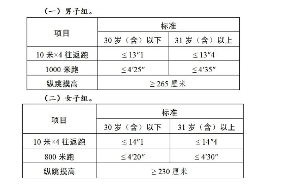 體能測評三項(xiàng)全部達(dá)標(biāo)方為合格。其中:縱跳摸高的測試次數(shù)不超過3次,10米×4往返跑的測試次數(shù)不超過2次,1000米跑/800米跑的測評次數(shù)為1次。