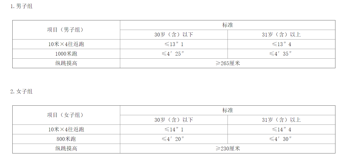 ?。ㄋ模w能測(cè)評(píng)的項(xiàng)目和標(biāo)準(zhǔn)。體能測(cè)評(píng)執(zhí)行《公安機(jī)關(guān)錄用人民警察體能測(cè)評(píng)項(xiàng)目和標(biāo)準(zhǔn)》和《公安機(jī)關(guān)錄用人民警察體能測(cè)評(píng)實(shí)施規(guī)則》有關(guān)規(guī)定,縱跳摸高每人最多可測(cè)3次,10米×4往返跑每人最多可測(cè)2次,男子1000米(女子800米)每人最多可測(cè)1次。體能測(cè)評(píng)的項(xiàng)目和標(biāo)準(zhǔn)如下: