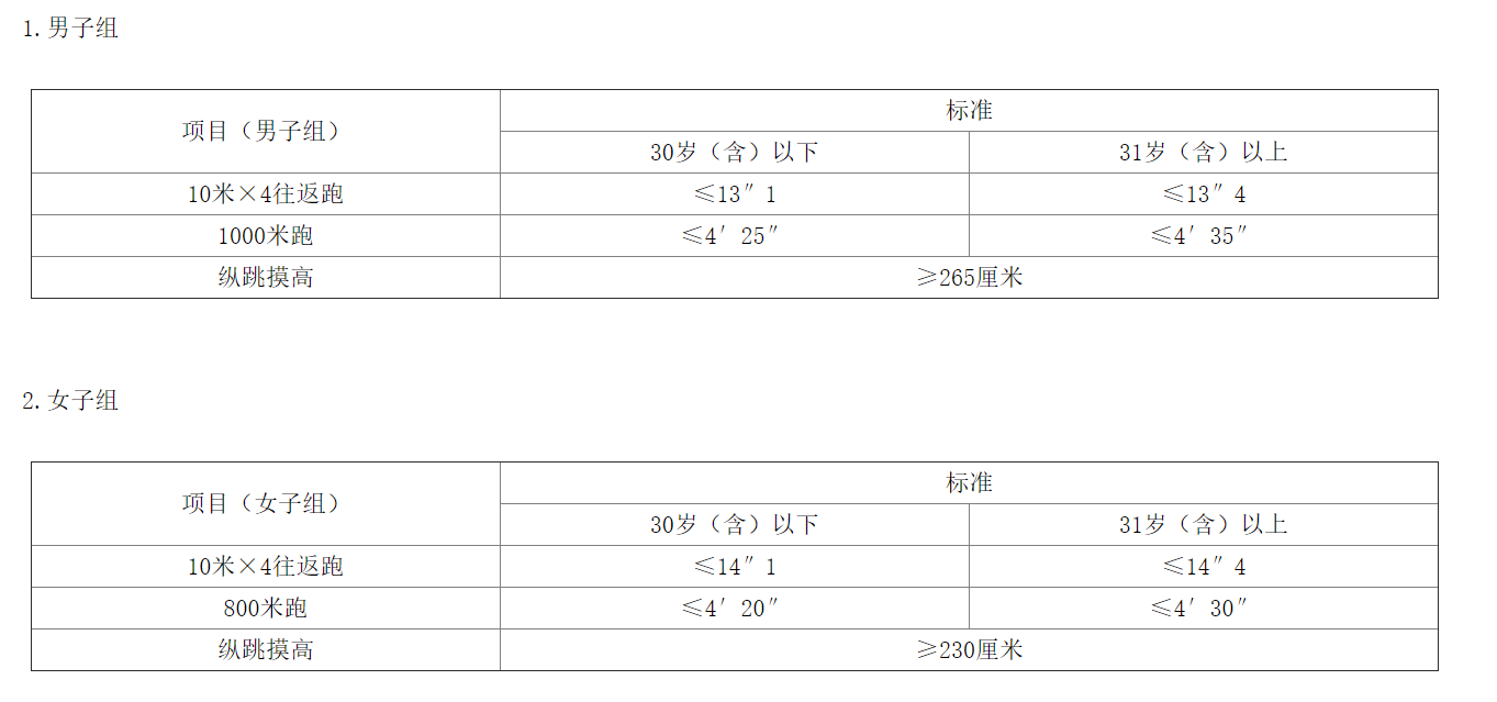 年齡計(jì)算時(shí)間截止到參加體能測評當(dāng)月。體能測評三項(xiàng)全部達(dá)標(biāo)的,視為合格。體能測評結(jié)果當(dāng)場公布。