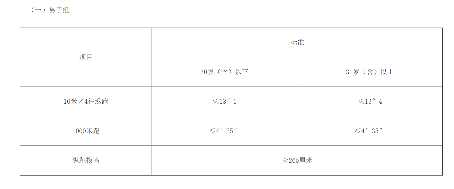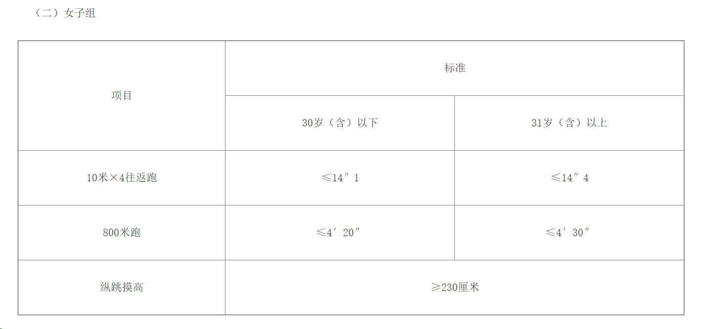 體能測評(píng)三項(xiàng)全部達(dá)標(biāo)方為合格。報(bào)考緊缺職位人員體能測評(píng)項(xiàng)目三項(xiàng)中有兩項(xiàng)達(dá)標(biāo)的,視為合格。體能測評(píng)項(xiàng)目中,縱跳摸高項(xiàng)目的測評(píng)次數(shù)不超過3次,10米×4往返跑項(xiàng)目的測評(píng)次數(shù)不超過2次,男子1000米跑、女子800米跑項(xiàng)目的測評(píng)次數(shù)為1次。