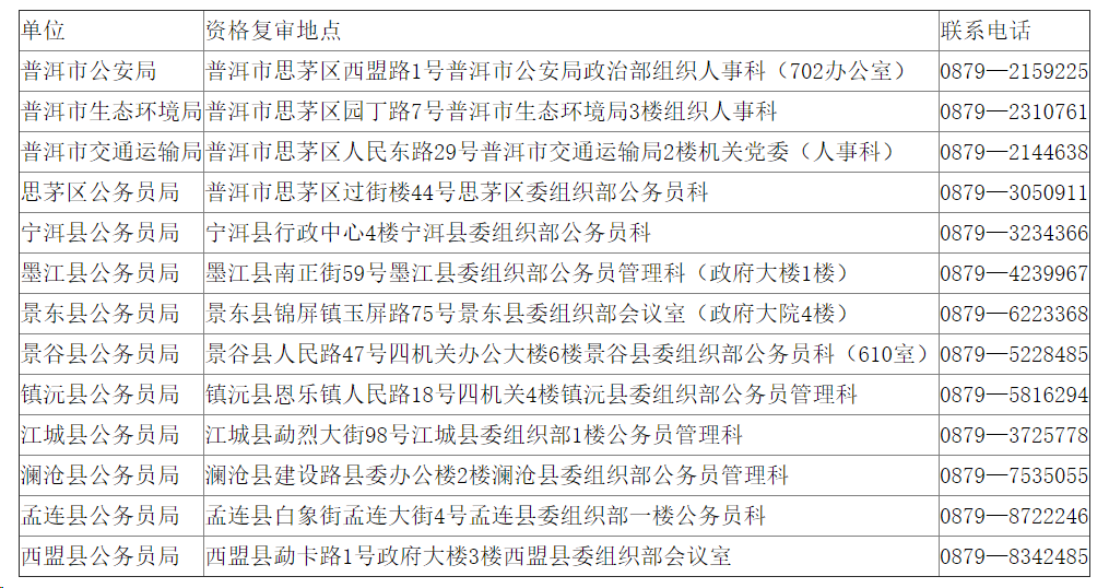 普洱市2024年度考試錄用公務員資格復審地點及聯(lián)系方式