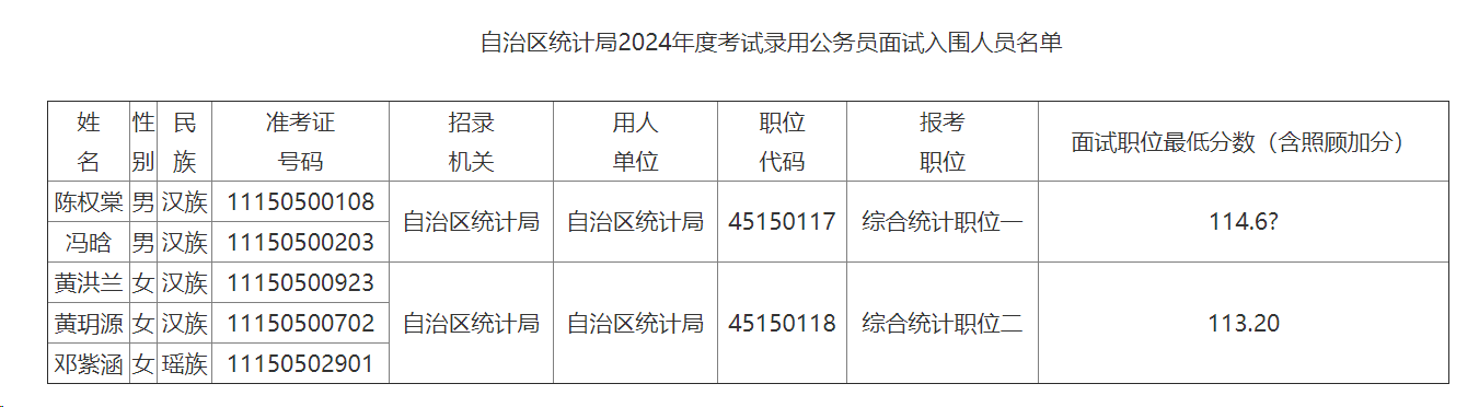 根據(jù)自治區(qū)公務(wù)員主管部門劃定的2024年度考試錄用公務(wù)員公共科目筆試合格分?jǐn)?shù)線和規(guī)定比例,按照筆試總成績(筆試總成績=行政職業(yè)能力測驗+申論成績+少數(shù)民族照顧加分)從高分到低分的順序,并經(jīng)資格審查確定陳權(quán)棠等5名考生進入面試(名單詳見附件1)。