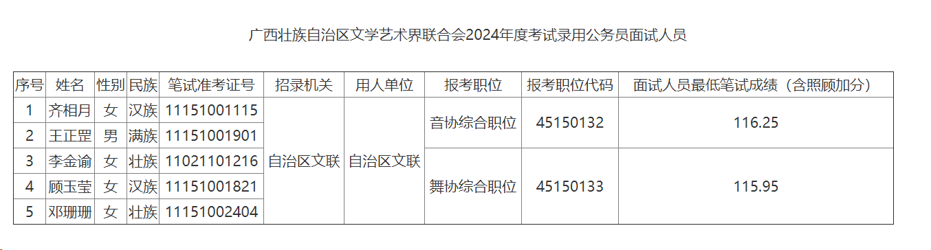 經(jīng)對(duì)廣西壯族自治區(qū)文學(xué)藝術(shù)界聯(lián)合會(huì)2024年度考試錄用公務(wù)員面試入圍人選進(jìn)行資格審查,確定齊相月等5名考生為面試人員(名單見(jiàn)附件1)。
