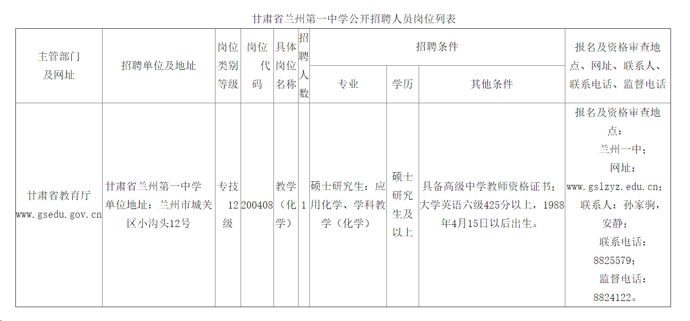 ?。┱衅腹嬖诟拭C省人力資源和社會(huì)保障廳網(wǎng)站(http://www.rst.gansu.gov.cn)和甘肅省蘭州第一中學(xué)官方網(wǎng)站(http://www.gslzyz.cn)公布。具體崗位招聘條件《崗位列表》見(jiàn)附件。