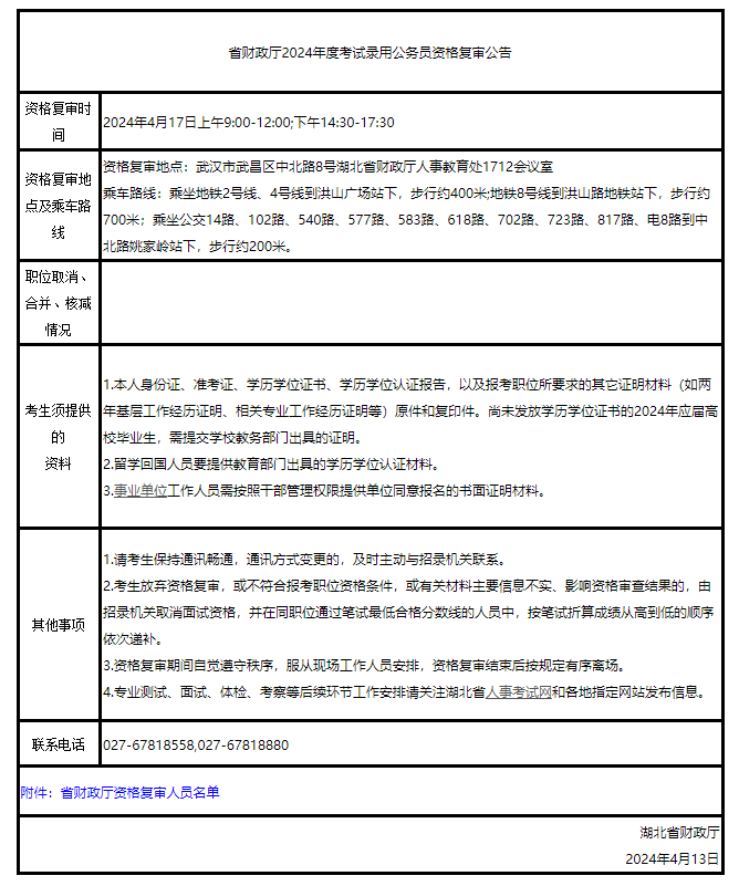 湖北省財(cái)政廳2024年度考試錄用公務(wù)員資格復(fù)審公告