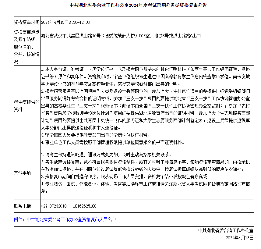 2024年中共湖北省委臺(tái)灣工作辦公室公務(wù)員考試資格復(fù)審公告