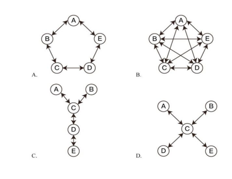 【答案】D【解析】第一步:找出定義要點(diǎn)。輪式網(wǎng)絡(luò):“一個(gè)下級(jí)同時(shí)與多個(gè)主管聯(lián)系”、“主管之間沒(méi)有溝通的情形”;Y式網(wǎng)絡(luò):“第二級(jí)有兩個(gè)上級(jí)與之聯(lián)系”、“第三級(jí)與一個(gè)或更多下級(jí)發(fā)生聯(lián)系”;環(huán)式網(wǎng)絡(luò):“每個(gè)成員僅與相鄰者聯(lián)系”、“不能與更遠(yuǎn)的成員進(jìn)行溝通”;全通道式網(wǎng)絡(luò):“所有成員間充分進(jìn)行溝通”、“所有成員的地位是平等的,無(wú)核心人物”。第二步:逐一分析選項(xiàng)。A項(xiàng):每個(gè)字符只與其相鄰的兩個(gè)字符間有聯(lián)系,與其他不相鄰的沒(méi)有聯(lián)系,符合“每個(gè)成員僅與相鄰者聯(lián)系”、“不能與更遠(yuǎn)的成員進(jìn)行溝通”,符合“環(huán)式網(wǎng)絡(luò)”定義,不符合“輪式網(wǎng)絡(luò)”定義,排除;B項(xiàng):每個(gè)字符與其他所有字符都有聯(lián)系,而且無(wú)核心字符,符合“所有成員間充分進(jìn)行溝通”、“所有成員的地位是平等的,無(wú)核心人物”,符合“全通道式網(wǎng)絡(luò)”定義,不符合“輪式網(wǎng)絡(luò)”定義,排除;C項(xiàng):字符C分別與兩個(gè)上級(jí)字符A、B以及一個(gè)下級(jí)字符D有聯(lián)系,符合“第二級(jí)有兩個(gè)上級(jí)與之聯(lián)系”、“第三級(jí)與一個(gè)或更多下級(jí)發(fā)生聯(lián)系”,符合“Y式網(wǎng)絡(luò)”定義,不符合“輪式網(wǎng)絡(luò)”定義,排除;D項(xiàng):字符C作為下屬時(shí),分別與多個(gè)主管字符A、B、C、D有聯(lián)系,但是主管字符A、B、C、D之間沒(méi)有聯(lián)系,符合“一個(gè)下級(jí)同時(shí)與多個(gè)主管聯(lián)系”、“主管之間沒(méi)有溝通的情形”,符合“輪式網(wǎng)絡(luò)”定義,當(dāng)選。