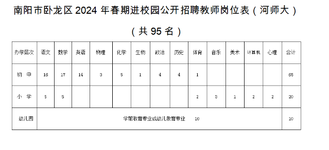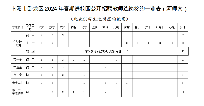 1、南陽市臥龍區(qū)2024年春期進(jìn)校園公開招聘教師崗位表(河師大)
