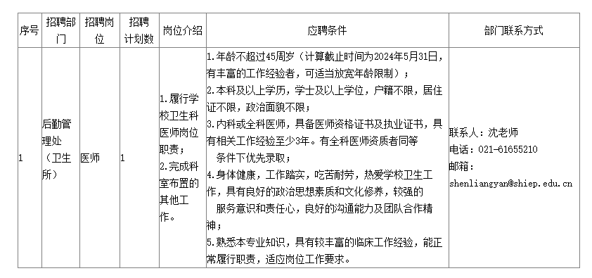 上海電力大學(xué)2024年醫(yī)師崗位招聘公告