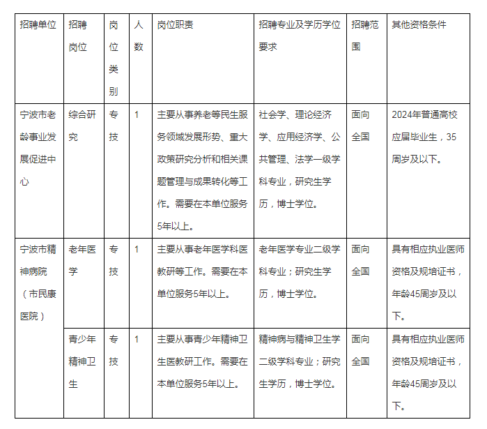 根據(jù)《寧波市事業(yè)單位公開(kāi)招聘工作人員實(shí)施辦法》的有關(guān)規(guī)定,寧波市民政局所屬事業(yè)單位寧波市老齡事業(yè)發(fā)展促進(jìn)中心和寧波市精神病院(市民康醫(yī)院)決定面向全國(guó)公開(kāi)招聘高層次人才3名。現(xiàn)就有關(guān)事項(xiàng)公告如下: