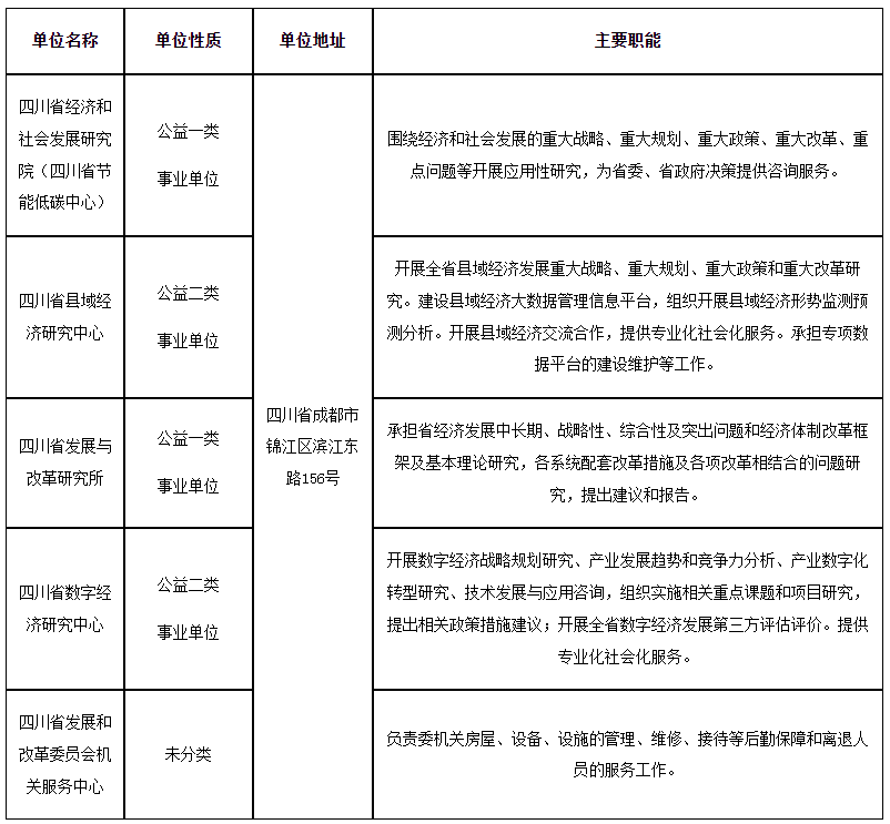 本次選調(diào)涉及我委直屬四川省經(jīng)濟和社會發(fā)展研究院(四川省節(jié)能低碳中心)、四川省縣域經(jīng)濟研究中心、四川省發(fā)展與改革研究所、四川省數(shù)字經(jīng)濟研究中心、四川省發(fā)展和改革委員會機關(guān)服務(wù)中心共5家事業(yè)單位7個崗位(共7個選調(diào)名額)。其中,四川省經(jīng)濟和社會發(fā)展研究院(四川省節(jié)能低碳中心)2名、四川省縣域經(jīng)濟研究中心1名、四川省發(fā)展與改革研究所1名、四川省數(shù)字經(jīng)濟研究中心2名、四川省發(fā)展和改革委員會機關(guān)服務(wù)中心1名。