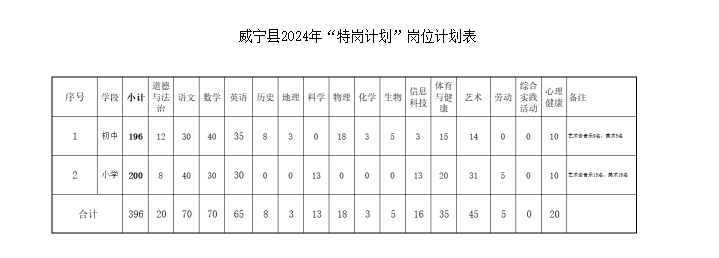 2024年,“特崗計(jì)劃”在我縣實(shí)施,共招聘396名。其中,初中196名,小學(xué)200名。具體分學(xué)科崗位招聘計(jì)劃詳見(jiàn)《威寧縣2024年“特崗計(jì)劃”教師招聘計(jì)劃表》(見(jiàn)附件1)。