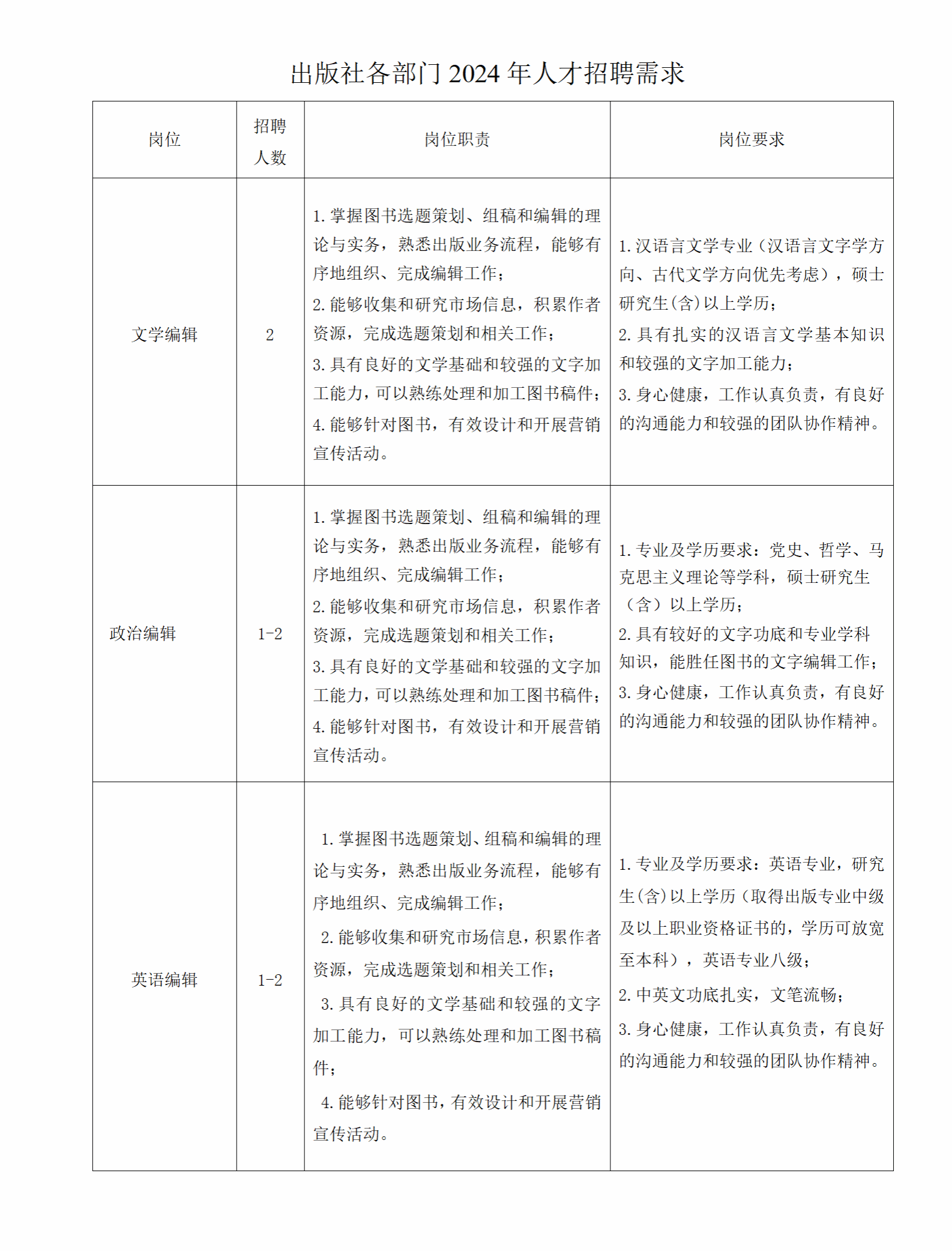 3.性別不限,身體健康,年齡35周歲及以下(1989年5月1日以后出生)。中共黨員優(yōu)先,有相關(guān)工作經(jīng)驗(yàn)者或取得出版專業(yè)中級及以上職稱應(yīng)聘人員年齡可適當(dāng)放寬。