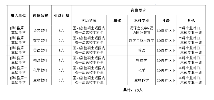 根據(jù)鄲城縣第一高級(jí)中學(xué)編制、崗位空缺及教學(xué)需要,面向社會(huì)公開招聘高學(xué)歷教師20名(其中語(yǔ)文6名、數(shù)學(xué)2名、英語(yǔ)6名、物理3名、化學(xué)2名、生物1名)。