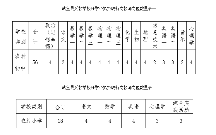 共招聘特崗教師74名,其中:初中56名,小學(xué)18名。具體崗位招聘計劃詳見崗位數(shù)量表一、表二: