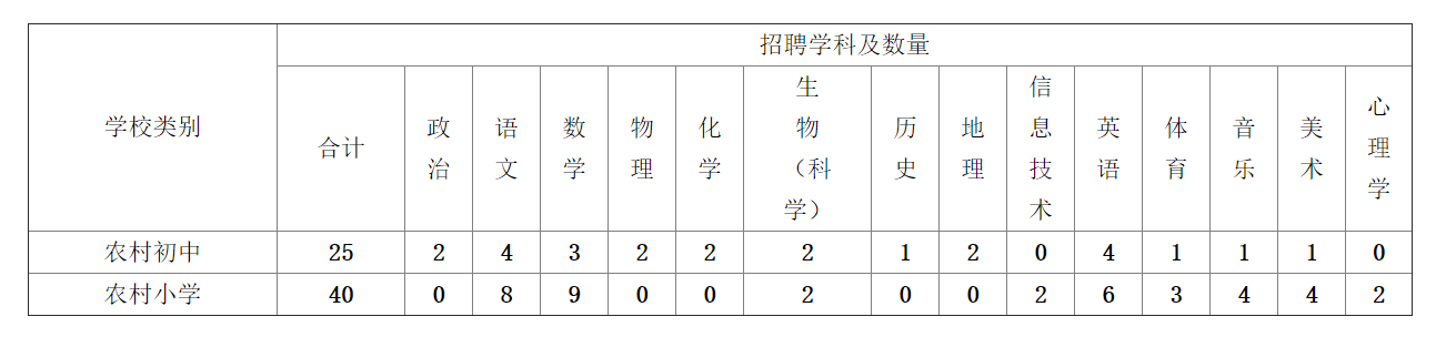 賓陽縣招聘義務(wù)教育特崗教師65名,其中農(nóng)村初中25名,農(nóng)村小學(xué)40名,招聘崗位詳見下表: