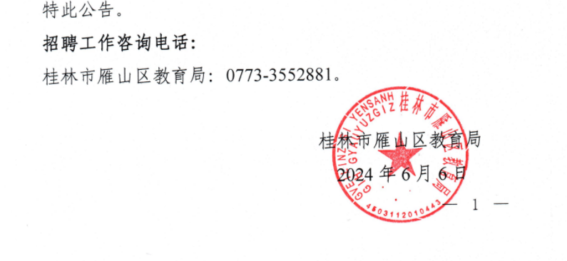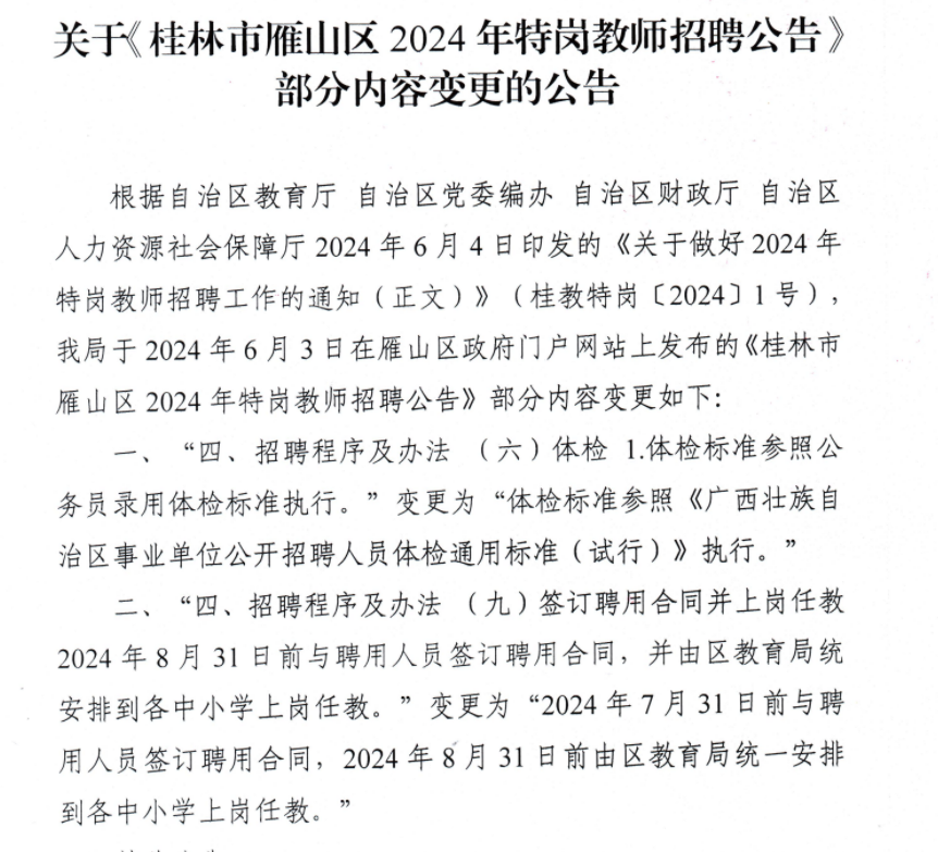 關(guān)于《桂林市雁山區(qū)2024年特崗教師招聘公告》部分內(nèi)容變更的公告