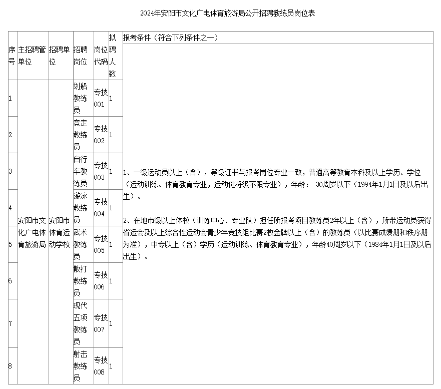 其他條件:詳見(jiàn)(附件1)《2024年安陽(yáng)市文化廣電體育旅游局公開(kāi)招聘教練員崗位表 》中資格條件欄。