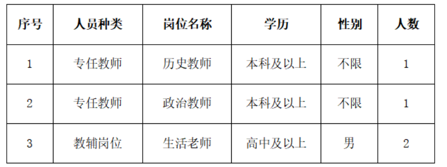 因?qū)W校實際用人需求,現(xiàn)招聘專任教師2名、教輔崗位2名。其中,歷史教師1名、政治教師1名、生活老師2名(男)。