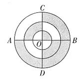 3.下圖中,三個(gè)同心圓的半徑分別為1厘米、2厘米、3厘米,AB與CD垂直且過圓心O。那么圖中陰影部分面積與非陰影部分的面積之比是多少( )