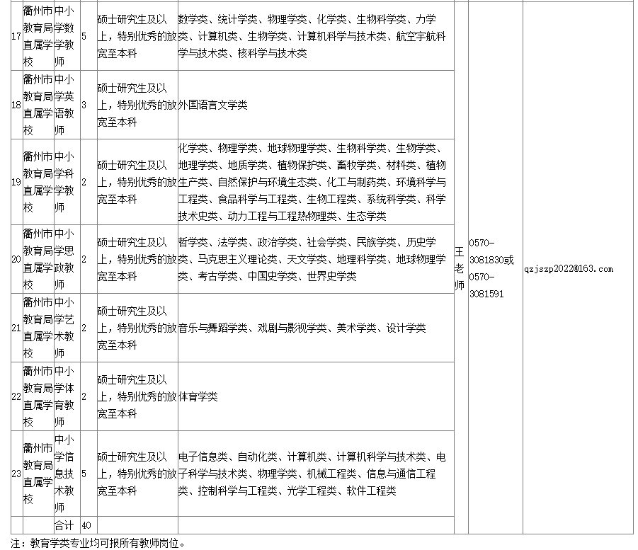 根據(jù)衢州市直(單位)公辦學(xué)校辦學(xué)需求,本次碩博專場(二)計劃招聘事業(yè)編制教育人才40人(具體單位、崗位、人數(shù)和報考資格條件詳見附件1)。