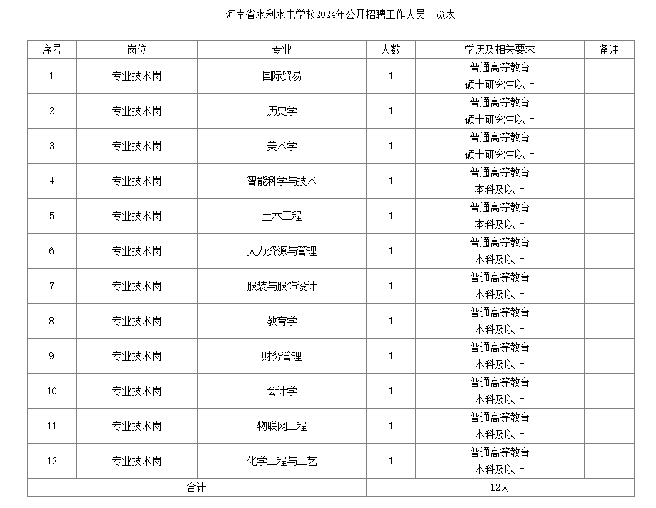 本次面向社會公開招聘工作人員12名,具體專業(yè)、人數(shù)等詳見《河南省水利水電學校2024年公開招聘工作人員一覽表》(附件)。