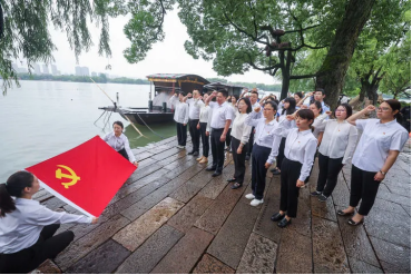 黨員們?cè)谡憬闻d南湖紅船旁重溫入黨誓詞。圖片來源:新華社
