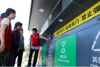 在安徽省合肥市長豐縣莊墓鎮(zhèn)棗林社區(qū),志愿者指導(dǎo)居民使用智能垃圾分類回收設(shè)備(2023年9月1日攝)。新華社記者曹力 攝