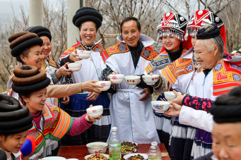 在位于烏蒙山區(qū)腹地的貴州省畢節(jié)市納雍縣,苗族村民馬雍(右五)與妻子黃國琴(左五)在年夜飯上與大家干杯(2021年2月11日攝)。新華社記者歐東衢 攝