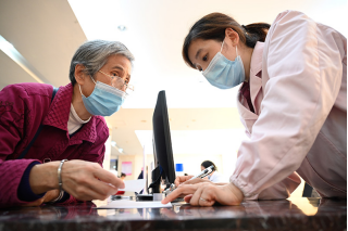 福建省三明市第一醫(yī)院醫(yī)保辦工作人員(右)向前來咨詢藥品報銷問題的居民講解相關(guān)政策(2020年11月18日攝)。新華社記者姜克紅 攝