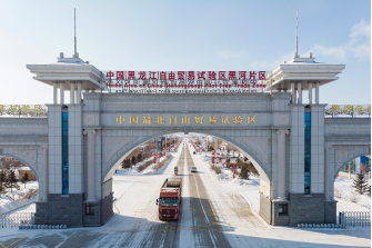 車輛駛出中國(黑龍江)自由貿(mào)易試驗區(qū)黑河片區(qū)大門(2023年2月11日攝,無人機照片)。新華社記者謝劍飛 攝