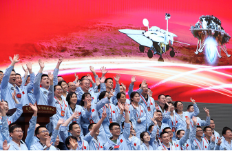 北京航天飛行控制中心青年科技人才群體慶祝我國首次火星探測任務(wù)著陸火星成功(2021年5月15日攝)。新華社記者金立旺 攝