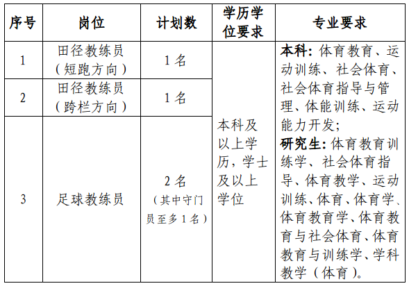 具有中華人民共和國國籍,遵紀(jì)守法,品行端正,熱愛教育體育事業(yè),具有良好的社會(huì)公德、教師和教練員職業(yè)道德,身體健康,專業(yè)(項(xiàng)目)對應(yīng),年齡要求為35周歲及以下(1988年7月25日及以后出生),且符合下列條件之一: