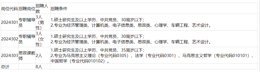 本次招聘人員為編外聘用合同制人員,其中專職輔導員6人,思政課教師2人。