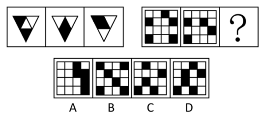 【解題】前兩圖經(jīng)黑白疊加形成第三個(gè)圖形,規(guī)律為:黑+白=黑,白+黑=黑,黑+黑=白,白+白=白,按此規(guī)律可得A項(xiàng)。因此,選擇A選項(xiàng)。