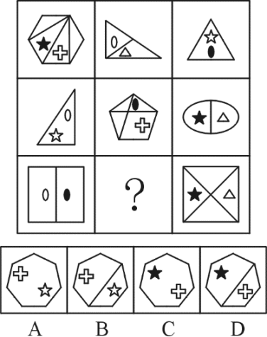 【答案】A【解析】每一行圖形內(nèi)部有6個(gè)小圖形,分別是黑星星,白星星,黑圈,白圈,白三角,十字。因此,第三行問號(hào)處內(nèi)部圖形應(yīng)該是白星星和十字,排除C,D。每一行封閉空間的數(shù)量分別是1,2,4,所以第三行問號(hào)處是一個(gè)封閉空間。因此本題選A。
